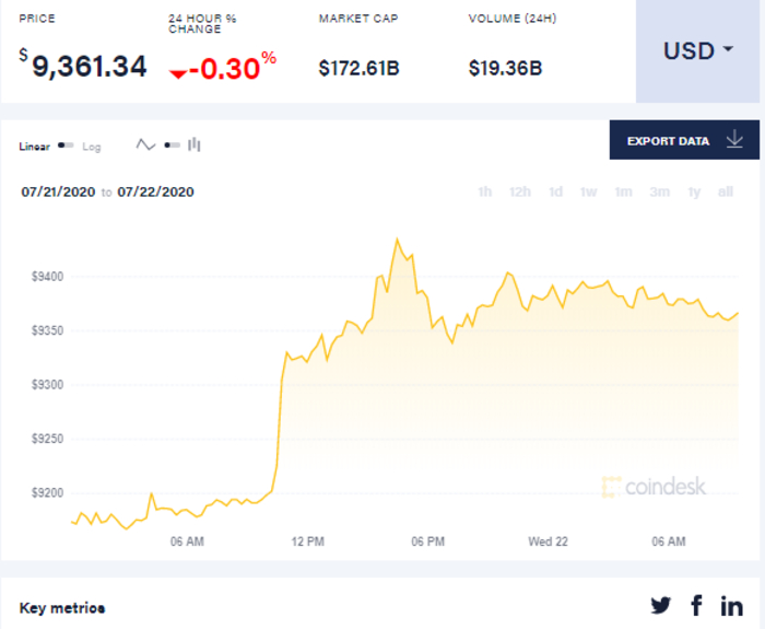 Так, на 9 утра 22 июля биткоин торгуется по 9,361.34 доллара. В целом с начала суток биткоин поднялся до 9381 доллара за единицу, а к утру - упал до 9374 долларов. Средняя цена на биткоин установлена в размере 9,361.34 долларов за единицу.