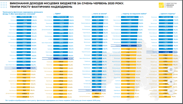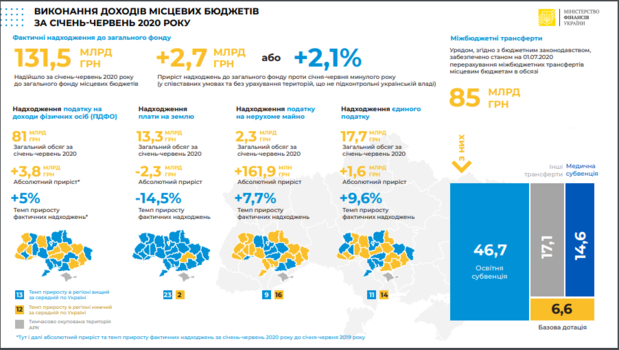 По состоянию на 1 июля 2020 года местные бюджеты получили от правительства страны в общей сложности 85 млрд грн, что составляет 100% от принятых бюджетных обязательств, в частности: