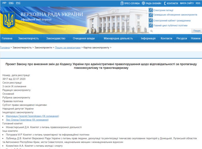 На сайте Верховной Рады появился законопроект №3917, предусматривающий ответственность за пропаганду гомосексуализма. Авторы документа - Георгий Мазурашу и Елена Лис.