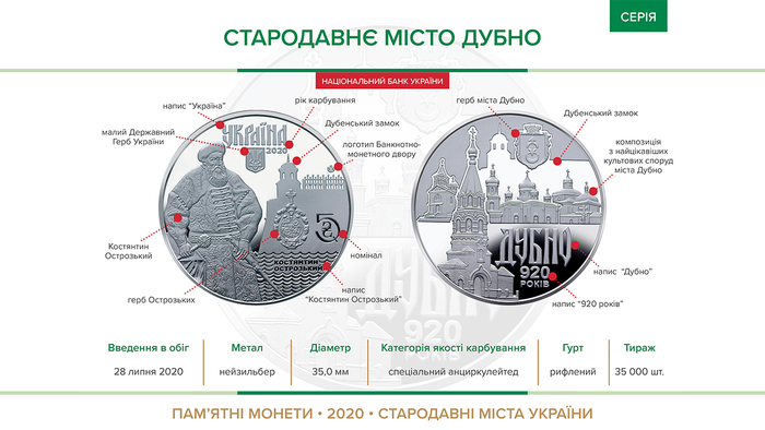 Национальный банк Украины с 28 июля ввел в оборот новую памятную монету "Древний город Дубно" из серии "Древние города Украины".