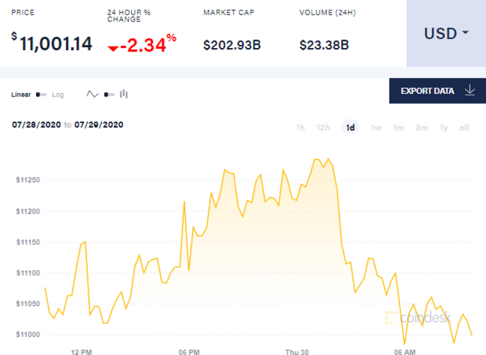 Так, на 9 утра 30 июля биткоин торгуется по 11,001.14 доллара. В целом с начала суток биткоин демонстрирует небольшое падение - с начала суток он поднялся до 11217 долларов за единицу, а к утру - вырос до 10983 доллара. Средняя цена на биткоин установлена в размере 11,001.14 долларов за единицу.