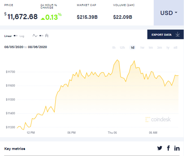 Так, на 9 утра 6 августа биткоин торгуется по 11,672.68 долларов. В целом с начала суток биткоин демонстрирует тенденцию к росту - в полночь он стоил 11 693 доллара за единицу, к утру он поднялся до 11 690 долларов. Средняя цена на биткоин установлена в размере 11,316 долларов за единицу.