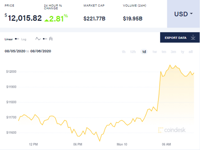 Так, на 9 утра 10 августа биткоин торгуется по 12,015.82 долларов. В целом с начала суток биткоин демонстрирует тенденцию к росту - в полночь он стоил 11673 доллара за единицу, к утру он поднялся до 12005 долларов. Средняя цена на биткоин установлена в размере 12,015.82 долларов за единицу.