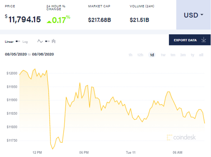 Так, на 9 утра 11 августа биткоин торгуется по 11,794.15 долларов. В целом с начала суток биткоин все еще падает - в полночь он стоил 11869 долларов за единицу, к утру он упал до 11862 долларов. Средняя цена на биткоин установлена в размере 11,794.15 долларов за единицу.
