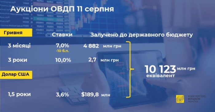 Благодаря аукционам по продаже облигаций внутреннего государственного займа Министерство финансов Украины 11 августа смогло привлечь в государственный бюджет 10,123 млрд грн.