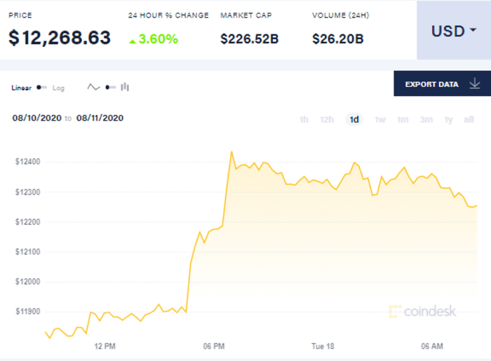 Так, на 8 утра 18 августа биткоин торгуется по 12,268.63 долларов. В целом с начала суток биткоин стабильно поднимается - в полночь он стоил 12342 доллара за единицу, к утру он немного упал - до 12314 долларов. Сейчас он также немного упал в сравнении с ситуацией к полуночи, сейчас на биткоин установлена в размере 12,268.63 долларов за единицу.