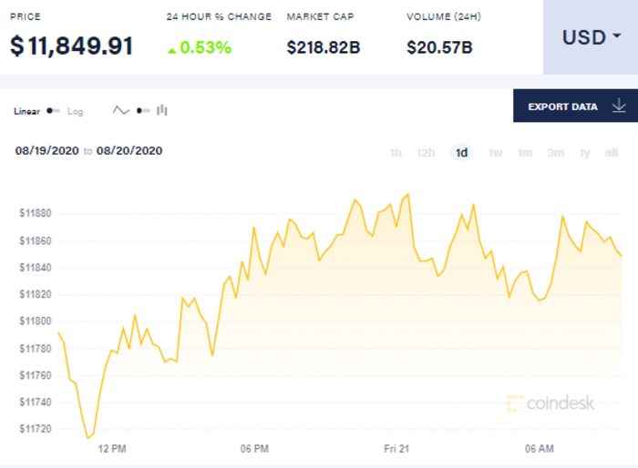Так, на 9 утра 21 августа биткоин торгуется по 11,849.91 долларов. В целом с начала суток биткоин стоил 11870 долларов за единицу, к утру он упал до 11817 долларов, но к 9 утра поднялся и торгуется по 11,849.91 долларов США.