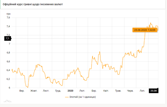 - 100 польских злотых - 732 грн (7,32 за злотый, -9 коп.)