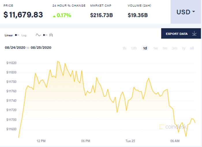 Так, на 9 утра 25 августа биткоин торгуется по 11,679.83 долларов. В целом с начала суток биткоин поднялся до 11747 долларов за единицу, но уже к шести часам утра он упал до 11673 долларов, но к девяти утра незначительно поднялся, до 11679 долларов.