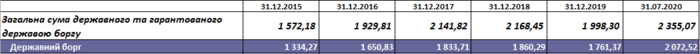 Государственный и гарантированный государством долг Украины за июль 2020 года возрос на 86 млрд грн, и сейчас составляет 2,355 трлн грн, или 85,05 млрд долларов США в инвалютном эквиваленте.
