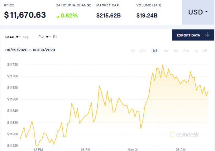 Так, на 9 утра 31 августа биткоин торгуется по 11,670.63 долларов. В целом с начала суток биткоин сначала вырос до 11644 долларов за единицу, к шести часам утра он вырос до 11686 долларов, а к девяти утра незначительно упал, до 11,670.63 долларов.