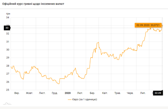 По состоянию на 2 сентября заметно, что существенное падение гривны продолжается. Евро пересек черту в 33 гривны за единицу.
