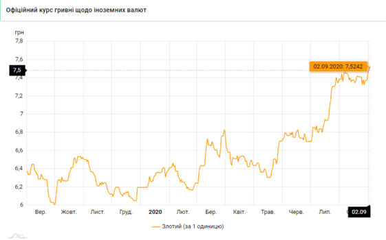 - 100 польских злотых - 752 грн (7,52 за злотый, +4 коп.)