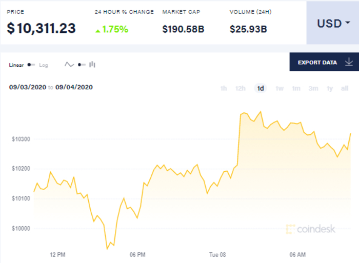Так, на 10 утра 8 сентября биткоин торгуется по 10,311.23 доллара. С начала суток биткоин подорожал до 10141 доллара за единицу, к шести часам утра он вырос до 10350 долларов, а к девяти утра опустился до 10,311.23 доллара за единицу.