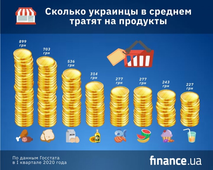 В первом квартале 2020 года больше всего средств у украинцев ушло на продукты питания и напитки. Доля этих трат составила 46,8%.