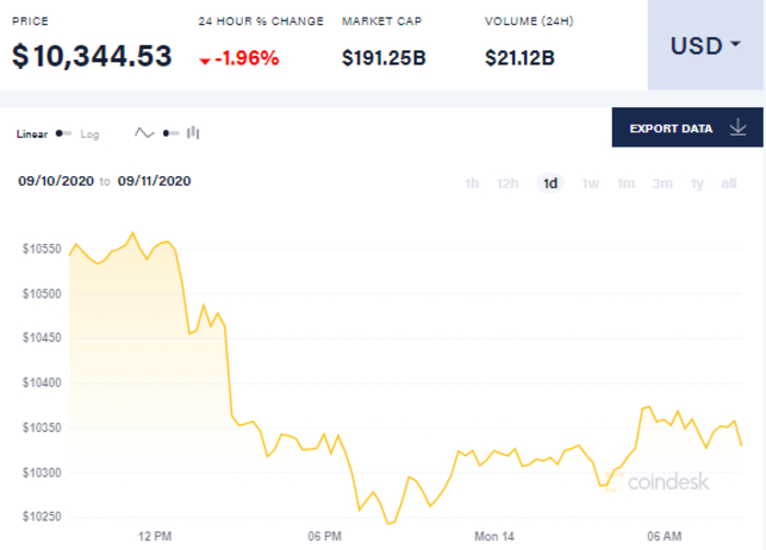 Так, на 9 утра 14 сентября биткоин торгуется по 10,344.53 доллара. С начала суток биткоин сначала вырос до 10324 долларов за единицу, к шести часам утра он подорожал до 10359 долларов, а к девяти утра немного упал, достигнув отметки в 10,344.53 доллара за единицу.