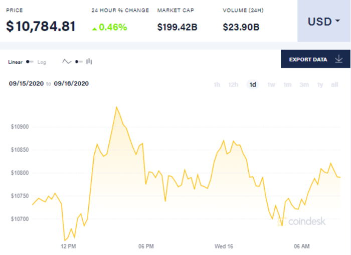 Так, на 9 утра 16 сентября биткоин торгуется по 10,784.81 доллара. С начала суток биткоин сначала вырос до 10869 долларов за единицу, к шести часам утра он упал до 10742 долларов, а к девяти утра немного поднялся, достигнув отметки в 10,784.81 доллара за единицу.