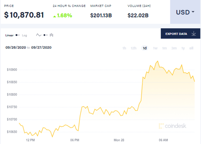 Так, на 10 утра 28 сентября биткоин торгуется по 10,870.81 доллара. С начала суток биткоин сначала вырос до 10727 долларов за единицу, к шести часам утра он поднялся до 10907 долларов, а к десяти утра незначительно упал, достигнув отметки в 10,870.81 доллара за единицу.