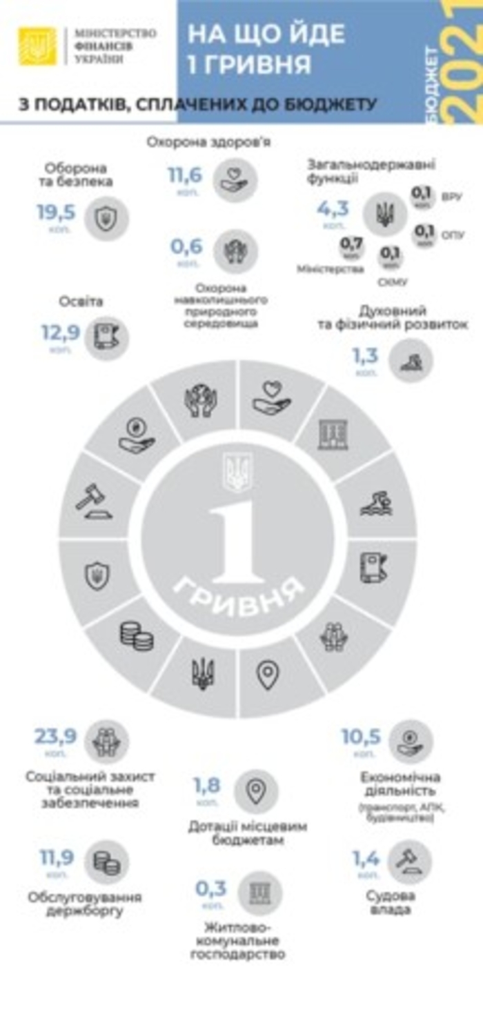 В 2021 году налоги станут основной доходной частью государственного бюджета. Немалую долю из них будут составлять налоги обычных украинцев. Самые большие траты в следующем году будут на социальное обеспечение - 23 копейки из каждой условной налоговой гривны в стране.