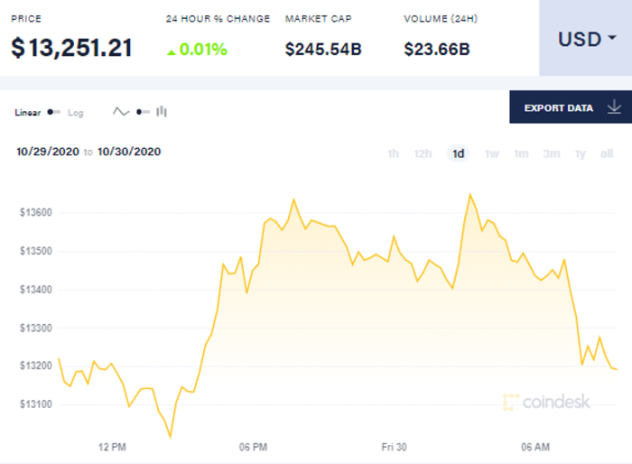 Так, на 9 утра 30 октября биткоин торгуется по 13,251.21 доллара. С начала суток биткоин вырос до 13537 долларов за единицу, к шести часам утра он упал до 13436 долларов, а к девяти утра снова упал и достиг отметки в 13,251.21 доллара за единицу.