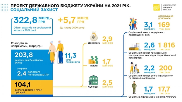 - На социальную защиту населения выделено 324 млрд грн. В частности, на расходы для Пенсионного фонда выделено 204 млрд грн.