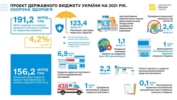 - На медицину выделено 156 млрд грн. В частности, предусматривается увеличение зарплат медиков на 30%