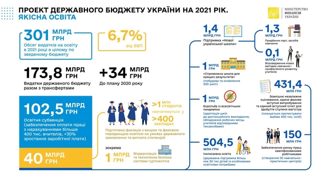 - На образование выделено 174 млрд грн. На доплаты зарплат учителям здесь предусмотрено 21,2 млрд грн (увеличение зарплат на 30%).