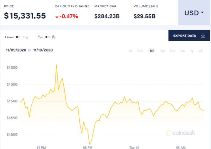 Так, на 9 утра 10 ноября биткоин торгуется по 15,331.55 доллара. С начала суток биткоин упал до 15379 долларов за единицу, к шести часам утра он рухнул до 15339 долларов, к девяти утра он снова упал и достиг отметки в 15,331.55 доллара за единицу.
