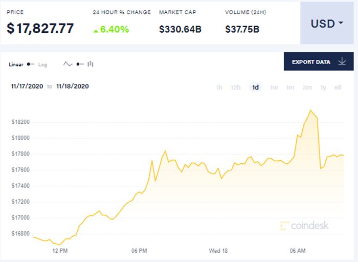 Так, на 9 утра 18 ноября биткоин торгуется по 17,827.77 доллара. С начала суток биткоин вырос до 17621 долларов за единицу, к шести часам утра он поднялся до 18037 долларов, к девяти утра он немного упал и достиг отметки в 17,827.77 доллара за единицу.