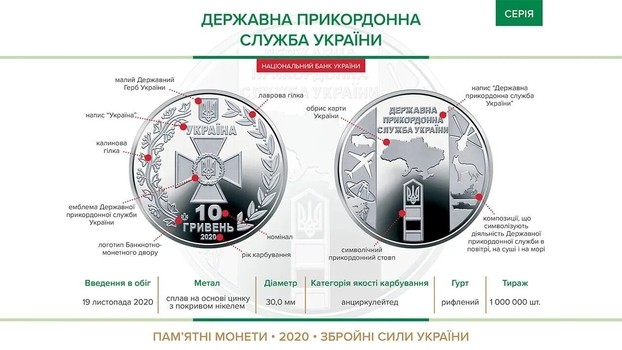 С 19 ноября 2020 года в Украине появится новая монета номиналом в 10 гривен. Она посвящена Государственной пограничной службе Вооруженных сил Украины.