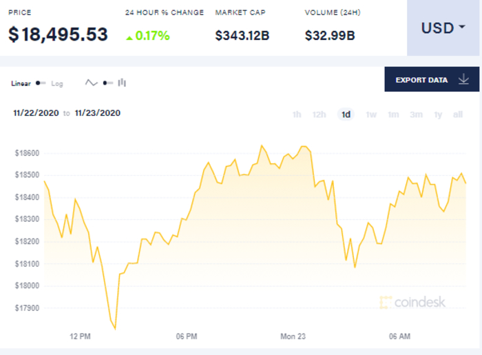 Так, на 10 утра 23 ноября биткоин торгуется по 18,495.38 доллара. С начала суток биткоин взлетел до 18596 долларов за единицу, к шести часам утра он упал до 18428 долларов, к девяти утра он достиг отметки в 18,495.38 доллара за единицу.