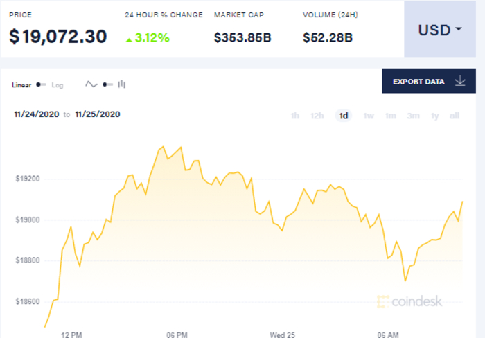 Так, на 10 утра 25 ноября биткоин торгуется по 19,072.30 доллара. С начала суток биткоин вырос до 18947 долларов за единицу, к шести часам утра он упал до 18811 долларов, к десяти утра он достиг отметки в 19,072.30 доллара за единицу.