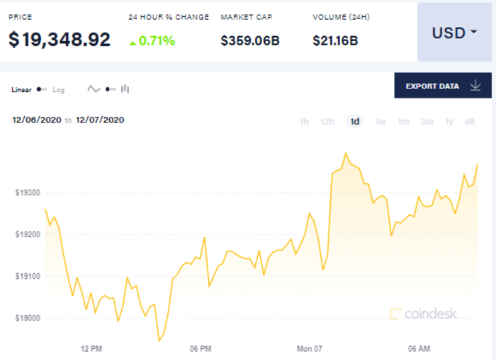 По состоянию на 7 декабря 2020 года основная криптовалюта мира - биткоин - продолжает расти, держась на уровне выше 19 тысяч долларов.