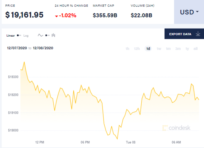 Так, на 9 утра 8 декабря биткоин торгуется по 19,161.95 доллара. С начала суток биткоин упал до до 19089 долларов за единицу, к шести часам утра он вырос до 19174 долларов, к девяти часам утра он вырос до 19,161.95 доллара за единицу.