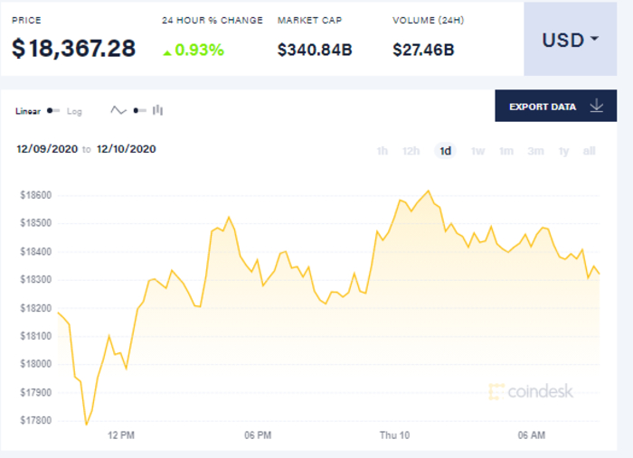 Так, на 9 утра 10 декабря биткоин торгуется по 18,367.28 доллара. С начала суток биткоин вырос до 18520 долларов за единицу, к шести часам утра он понизился до 18417 долларов, к девяти часам утра он упал до 18,367.28 доллара за единицу. Таким образом, суточный рост криптовалюты составил чуть менее 200 долларов.