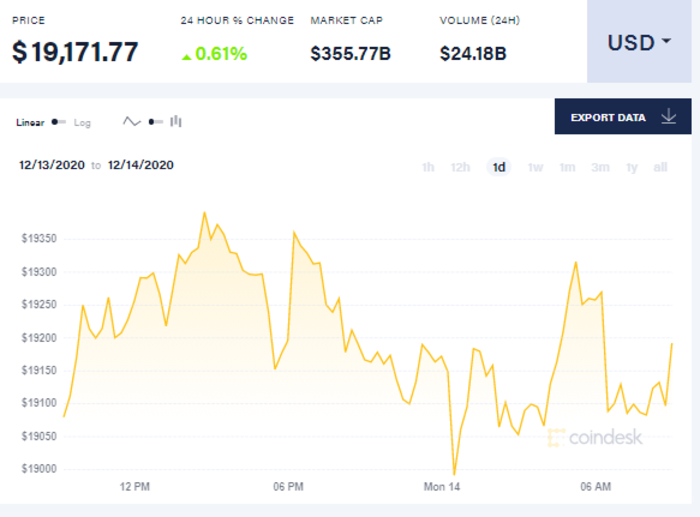 По состоянию на 14 декабря 2020 года основная криптовалюта мира - биткоин - после отката начал снова расти в цене и уже перевалил за 19 тысяч.