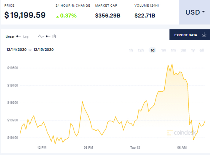 По состоянию на 15 декабря 2020 года основная криптовалюта мира - биткоин - продолжает держаться на уровне немного выше 19 тысяч долларов.