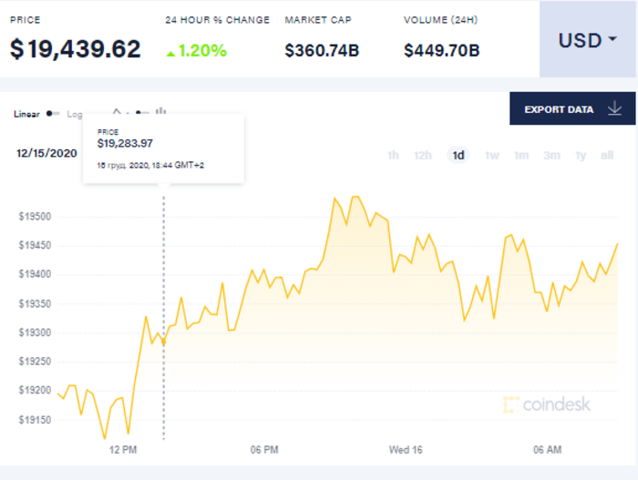 По состоянию на 16 декабря 2020 года основная криптовалюта мира - биткоин - продолжает держаться на уровне немного выше 19 тысяч долларов.