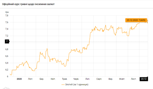 - 100 польских злотых - 766 грн (7,66 за злотый, +9 коп.)