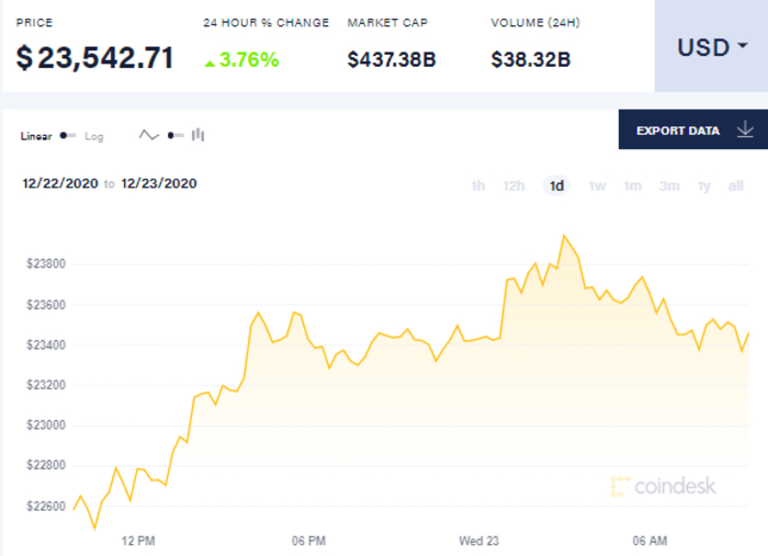 По состоянию на 23 декабря 2020 года основная криптовалюта мира - биткоин - после кратковременного отката снова пошла вверх.