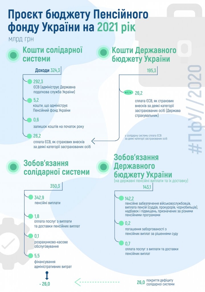 Расходы солидарной пенсионной системы - т.е. за счет собственных поступлений ПФУ - предусмотрены на уровне в 350,3 млрд грн (+3,3% против 2020 года), еще 143,1 млрд грн составят обязательства государственного бюджета.