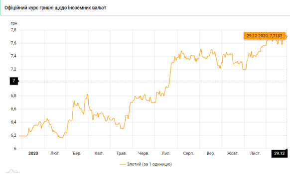 - 100 польских злотых - 771 грн (7,71 за злотый, +4 коп.)