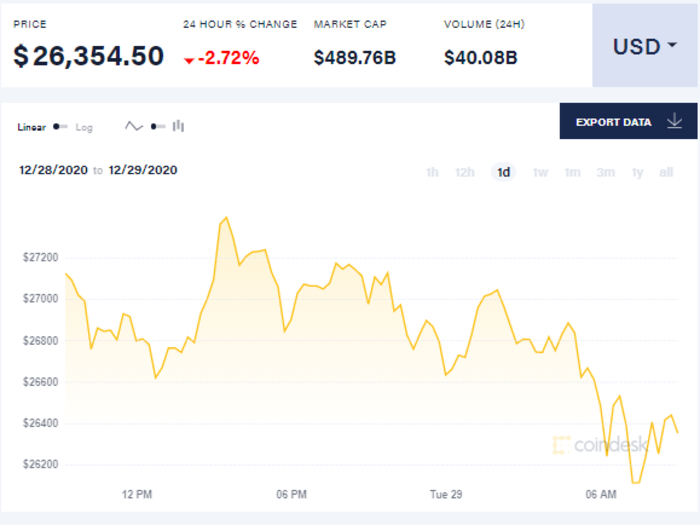 По состоянию на 29 декабря 2020 года основная криптовалюта мира - биткоин - удерживается на уровне более 26 тысяч долларов, понемногу дешевея.