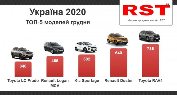 Новые авто суммарно обошлись автовладельцам в 300 млн долларов США. Больше всего купили машин марки Toyota - 1,7 тыс. единиц, также в топ по продажам бренды Renault и Skoda. В общем, доля этих трех марок автомобилей составила 42% от общего количества проданных машин в декабре. Самыми популярными машинами стали кроссовер Toyota RAV4, а также Renault Duster и Kia Sportage.