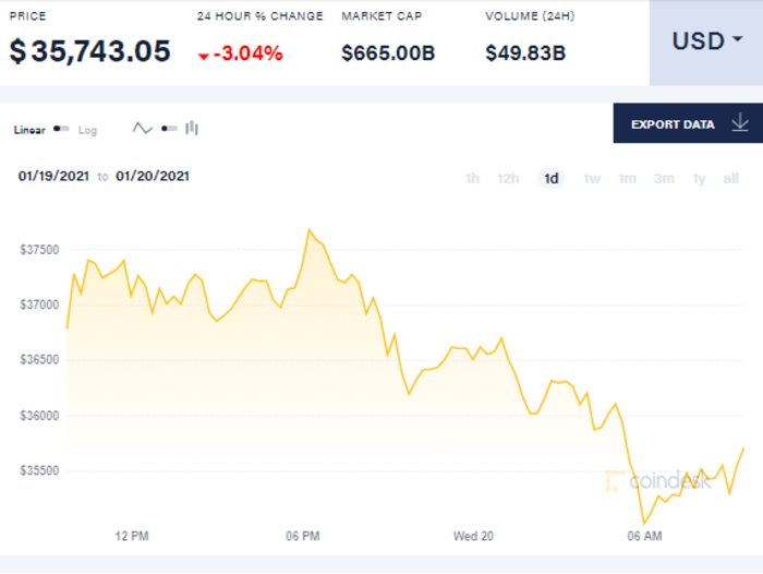 Так, на 9:00 утра 20 января биткоин торгуется по 35,743.05 доллара. С начала суток биткоин упал до 36503 долларов за единицу, к шести часам утра он опустился до 35022 долларов, к десяти часам утра он поднялся до 35,743.05 доллара за единицу. Таким образом, падение биткоина за сутки составило около 900 долларов.