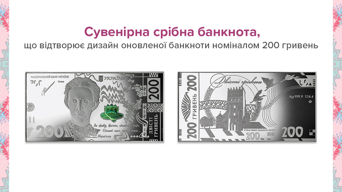 Национальный банк Украины к 150-летнему юбилею украинской писательницы Леси Украины (Ларисы Ковач) 21 января 2021 года выпустит сувенирную банкноту из серебра номиналом 200 гривен, которая воспроизводит дизайн обновленной банкноты в 200 гривен образца 2019 года.