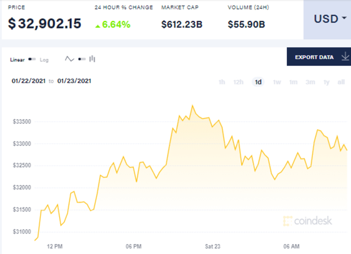 Так, на 10:00 утра 23 января биткоин торгуется по 32,902.15 доллара. С начала суток биткоин вырос до 33377 долларов за единицу, к шести часам утра он опустился до 32450 долларов, к десяти часам утра он поднялся до 32,902.15 доллара за единицу. Таким образом, рост биткоина за сутки составило около 1600 долларов.