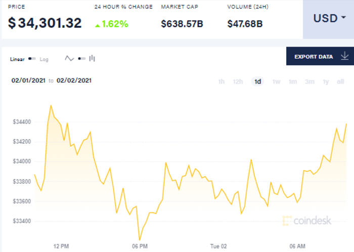 По состоянию на 2 февраля 2021 года основная криптовалюта мира - биткоин - продолжает расти, перейдя отметку в 34 тысячи долларов.