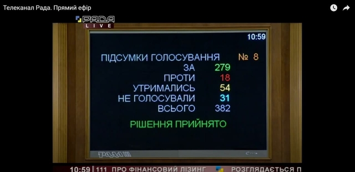Верховная Рада Украины 279 голосами "за" утвердила новую редакцию Закона о финансовом лизинге, приняв законопроект №1111.