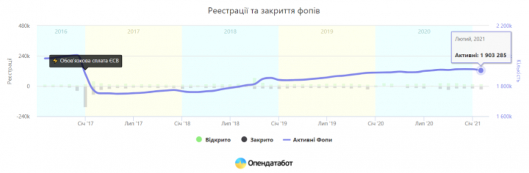 В Украине по состоянию на 1 февраля 2021 года зарегистрировано около 2 млн физических лиц - предпринимателей (ФЛП, укр. ФОП). В среднем, каждый месяц их число растет на 7 тысяч - около 20 тыс. открывшихся против 13 тыс. закрывшихся.